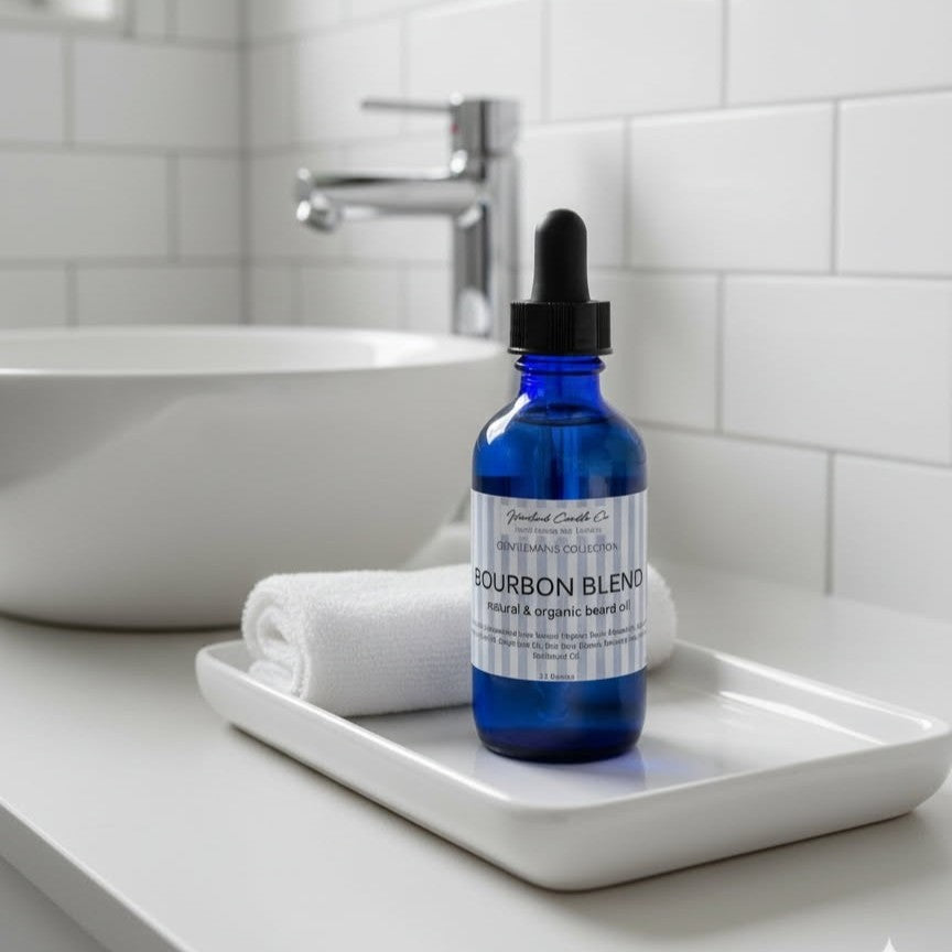 Our Gentleman's Collection Beard Oil is all natural and organic. Formulated from Natural Organic Sweet Almond oil, Castor Seed Oil, Olive Seed Oil, Rice, Bran, Rosemary leaf and more. Our Bottles are 2 fl. oz with a squeeze eye dropper dispenser top. We Offer Our Beard Oil in eight Masculine Fragrances: Black Ice, Bleu, Bourbon Blend, Citron Cedarwood, Coastal Waters, Midnight For Men, Sandalwood & The Gentleman.