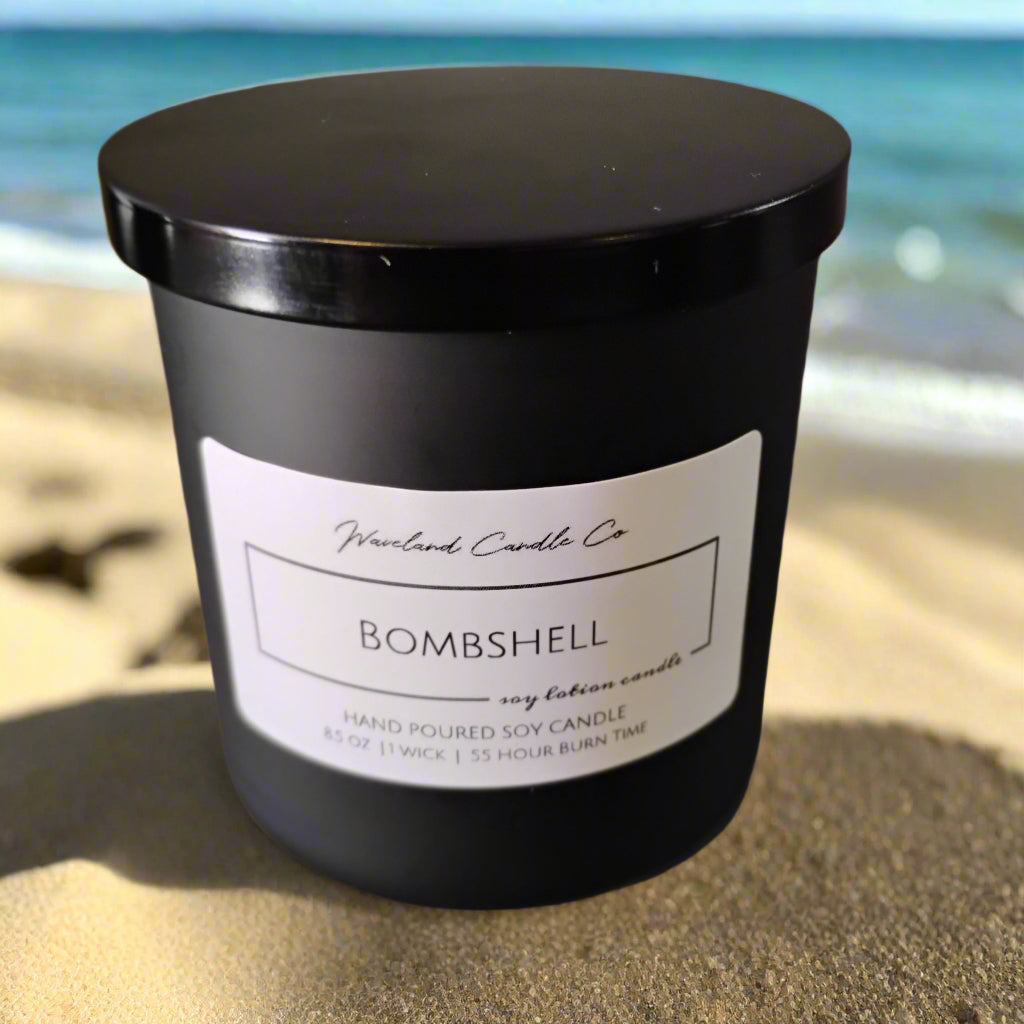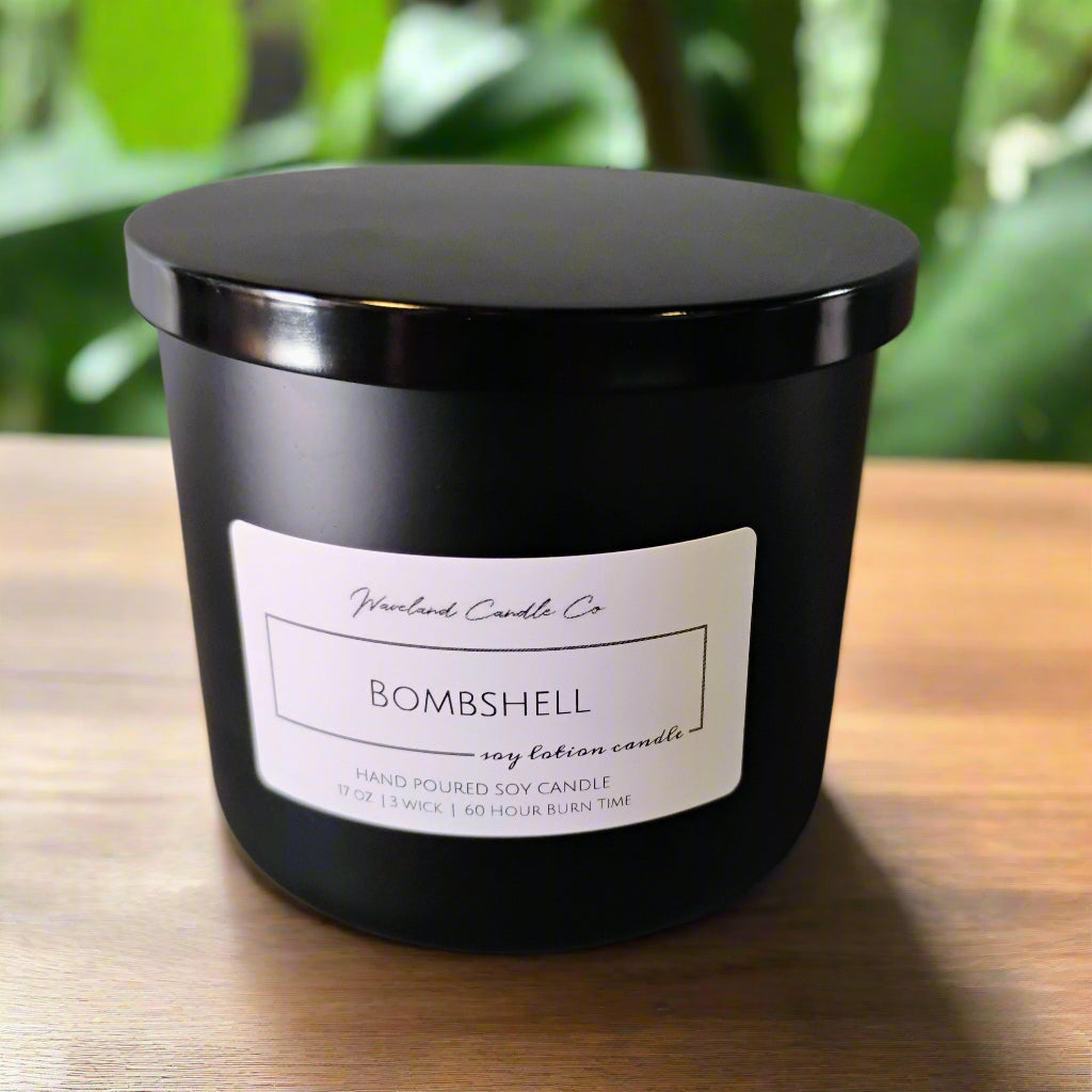 Experience the luxurious aroma and nourishing benefits of Bombshell Soy Candles. Our candles are handcrafted and hand poured with 100% natural soy oil extracted from soybeans. Choose from a variety of sizes, including the stylish 17 oz 3 Wick Matte Black Luxury Vessel and the convenient 7 oz Luxury Tin Soy candles. Each candle is carefully created for exceptional quality and a longer burning time. These "Soy Lotion Candles" feature cotton braided wicks, 12% premium skin-safe and non-allergenic fragrance oils, and a reusable vessel. Immerse yourself in the delightful scent that fills the room, then use the warm, melted soy wax as a moisturizer for your skin. Say goodbye to greasy lotions and give soy's nourishing properties a try, perfect for those with eczema and psoriasis. Elevate your candle experience with Bombshell.